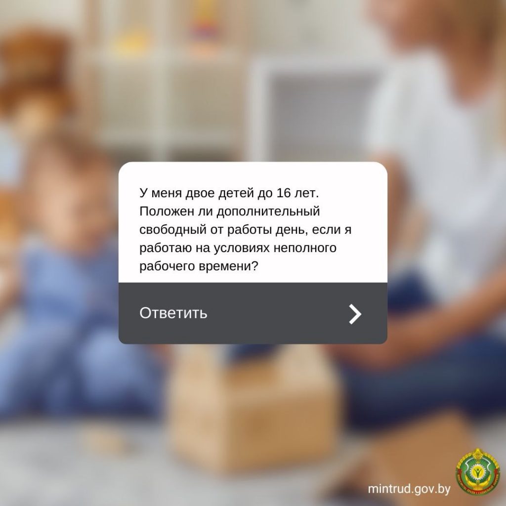 Согласно части третьей ст. 265 Трудового кодекса, мать (или отец, мачеха/отчим, опекун, попечитель), воспитывающая двоих детей в возрасте до 16 лет, имеет право на один дополнительный свободный от работы день в месяц.