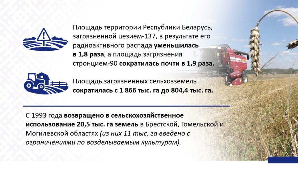 Благодаря принимаемым мерам с 1993 года возвращено в сельскохозяйственное использование 20,5 тыс. га земель в Брестской, Гомельской и Могилевской областях (из них 11 тыс. га введено с ограничениями по возделываемым культурам) со строгим радиологическим контролем качества производимой продукции.