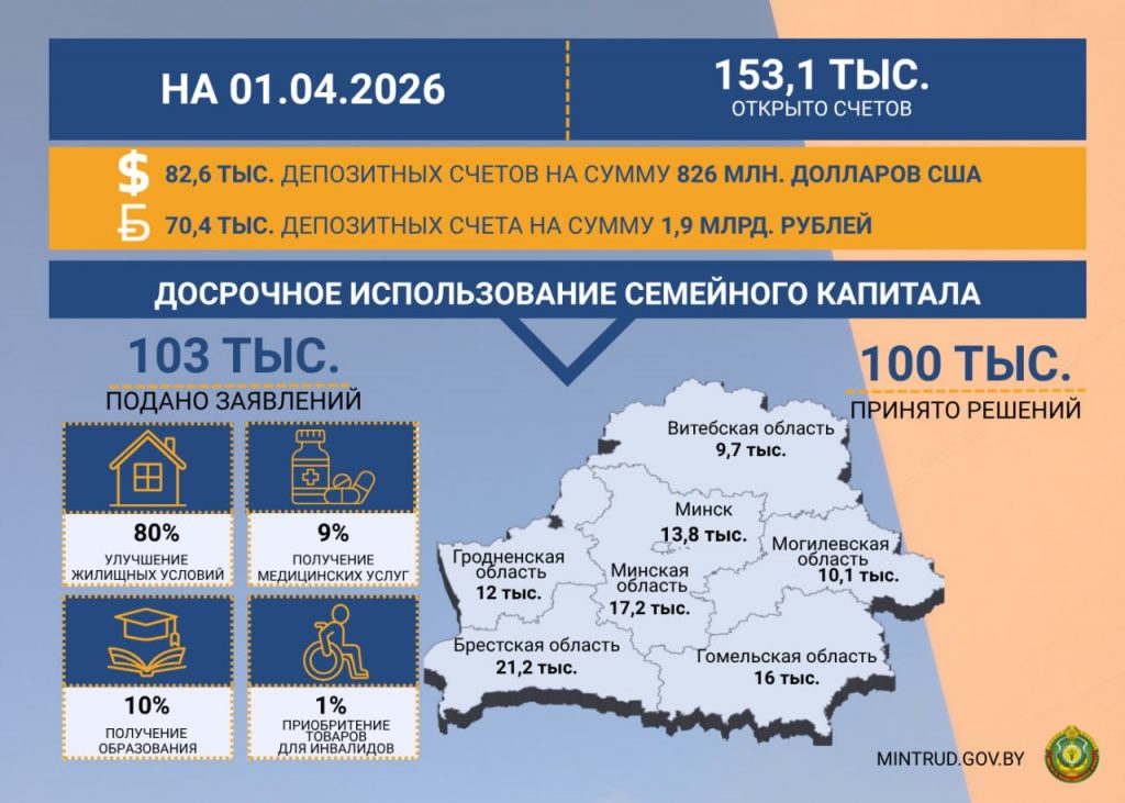 ✍️ Для многодетных семей открыто 153,1 тыс. депозитных счетов «Семейный капитал»: